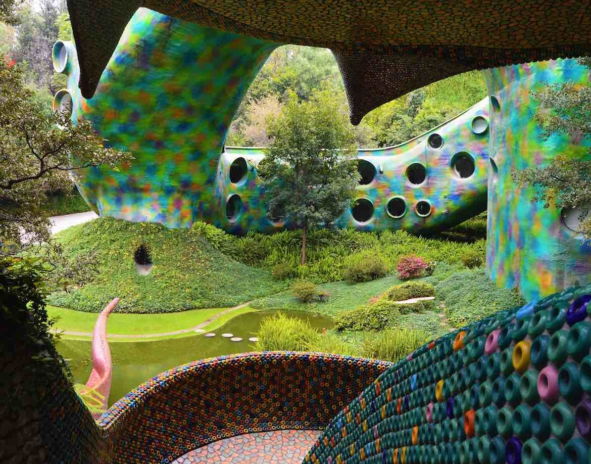 En paralelo, Senosiain inspeccionó una cueva existente en el predio y detectó que el espacio no representaba peligro alguno. En la entrada de la oquedad colocó una cabeza de serpiente, con las fauces abiertas, hecha de concreto y que funge como mirador; posteriormente, la recubrió con donas de cerámica y mosaicos multicolores realizados en talleres de alfarería de Dolores Hidalgo, Guanajuato y que honran el arte ritual en chaquira de la comunidad wixárika o huichol.