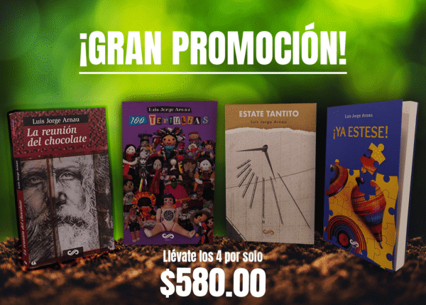 ¡Oferta especial! Adquiere la colección de libros de Luis Jorge Arnau, incluyendo ‘La reunión del chocolate’, ‘¡Ya estese!’, ‘100 Tertulias’ y su última publicación ‘Estate tantito’, todo por solo $600.00 MXN. ¡No te pierdas esta oportunidad!